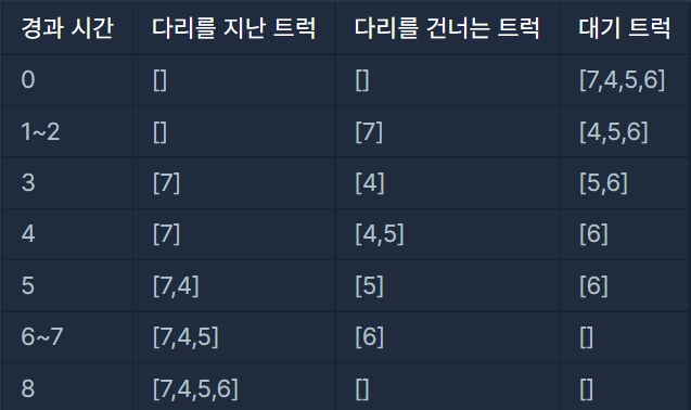 예를 들어, 트럭 2대가 올라갈 수 있고 무게를 10kg까지 견디는 다리가 있습니다. 무게가 [7, 4, 5, 6] kg인 트럭이 순서대로 최단 시간 안에 다리를 건너려면 다음과 같이 건너야 합니다.