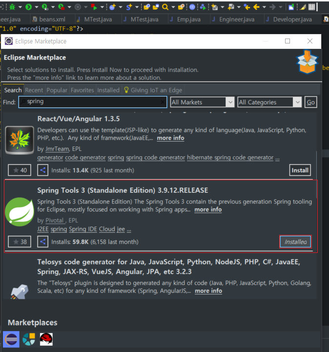2. Find 검색창에 spring을 검색하고, Spring Tools 3 3.9.12.RELEASE를 다운받았다.