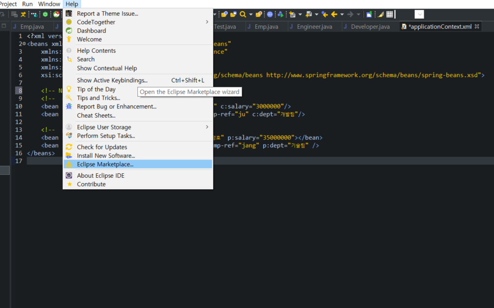 1. eclipse가 설치 된 상태에서 상단 메뉴에 Help에 Eclipse Marketplace에 들어간다.