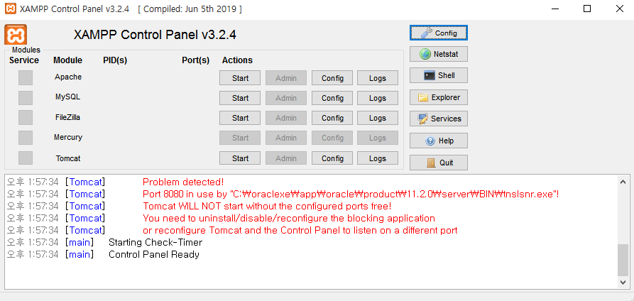 오후 1:57:34 [Tomcat] Port 8080 in use by "C:\oraclexe\app\oracle\product\11.2.0\server\BIN\tnslsnr.exe"!