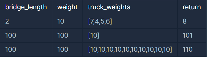 solution 함수의 매개변수로 다리에 올라갈 수 있는 트럭 수 bridge_length, 다리가 견딜 수 있는 무게 weight, 트럭 별 무게 truck_weights가 주어집니다. 이때 모든 트럭이 다리를 건너려면 최소 몇 초가 걸리는지 return 하도록 solution 함수를 완성하세요.